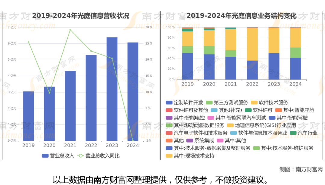 根据公司年度数据显示(如上图),2024年,光庭信息实现营业总收入6.07亿,同比增长-4.92%,近5年复合年增长率16.09%。