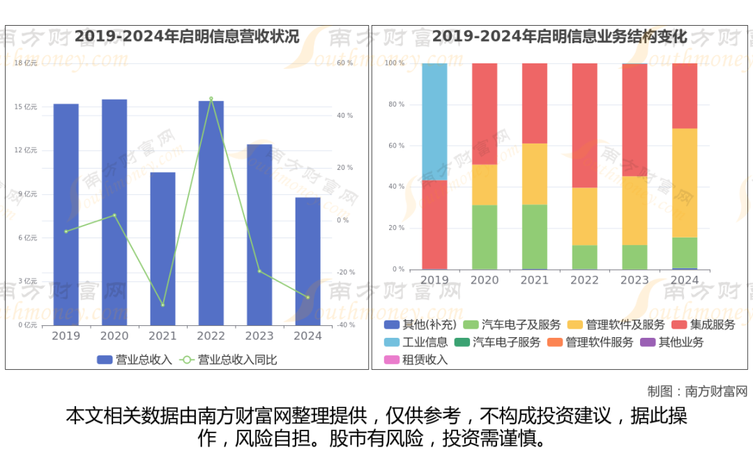 (如上图)2024年启明信息公司营业总收入8.78亿,同比增长-29.35%,近五年复合增长率为-13.26%。