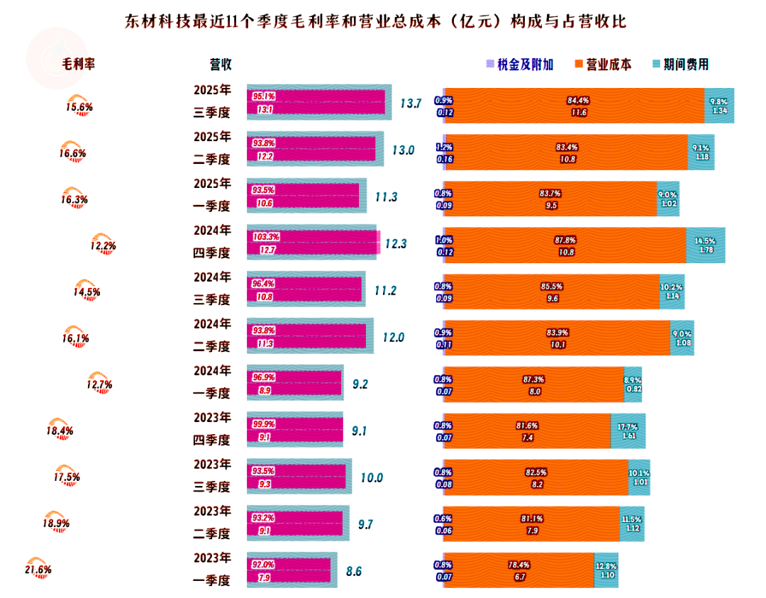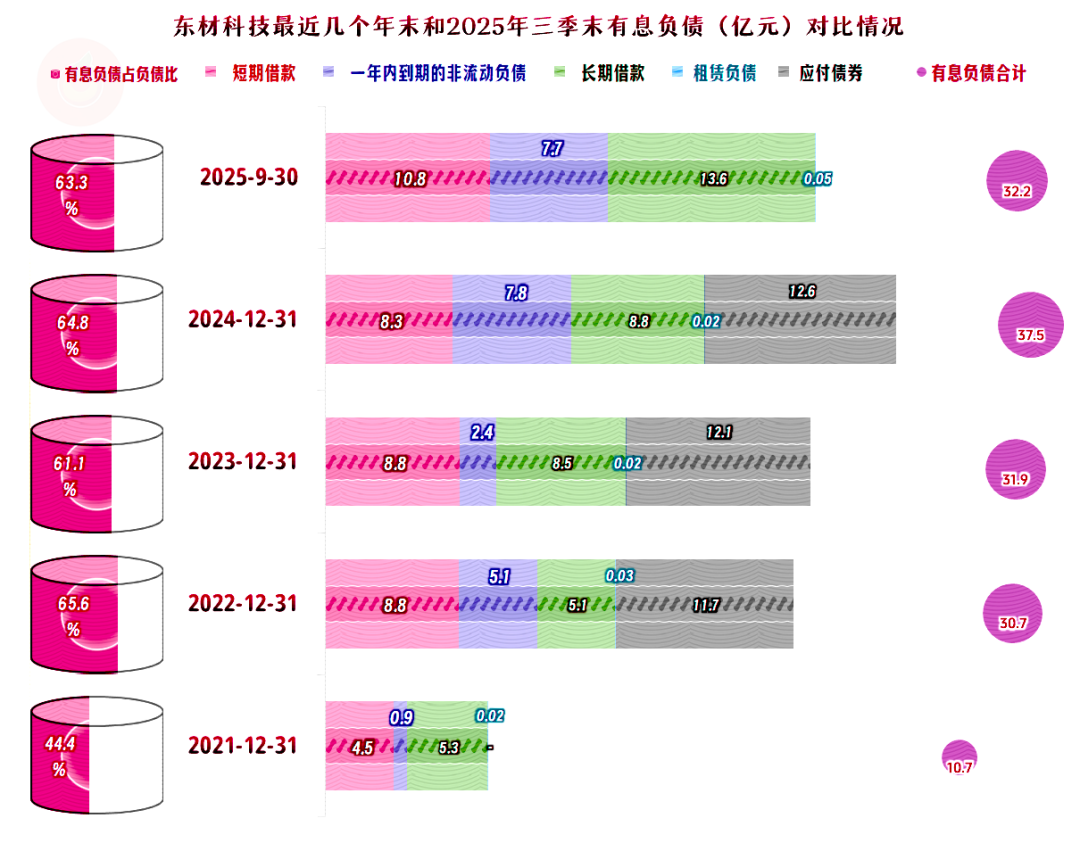 有息负债的规模在2024年末达到了37.5亿元的峰值后,2025年三季度末有所下降。这样的间接融资规模对东材科技来说并不算特别高,在正常情况下,是没什么压力的,如果毛利率的再次下滑至更低的区间,压力就会逐步上升起来。当然,我们希望这样的事情最好不要发生。