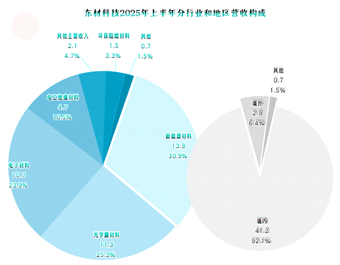 新能源材料、光学膜材料、电子材料和电工绝缘材料是东材科技的主要业务,还有少量的环保阻燃材料和其他主营业务等。境外市场的占比为6.4%,主要的市场还是在国内。