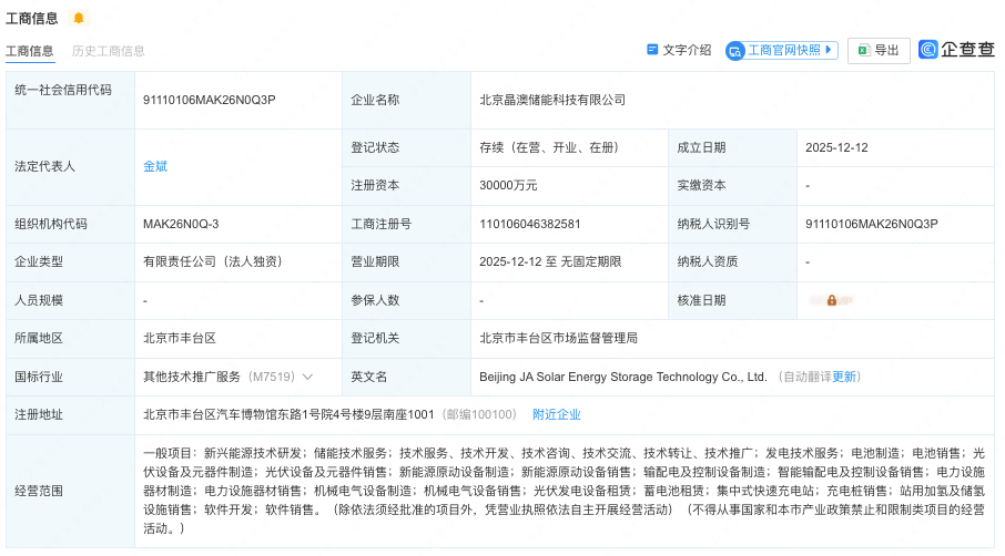 根据企查查资料,新成立的公司经营范围涵盖电池制造、电池销售、储能技术服务及站用加氢及储能设施销售等,由晶澳太阳能有限公司全资持股。