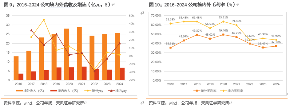 2024年公司境外收入25.66亿元,毛利率为37.1%;境内收入6.74亿元,毛利率为43.9%。公司保健食品原料、饲料添加剂生产主要在境内进行,均为全球竞争产品,出口比例较高;保健食品终端产品生产、销售和品牌运营主要在境外进行。