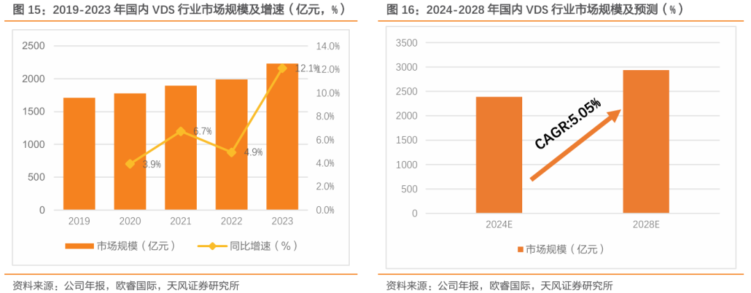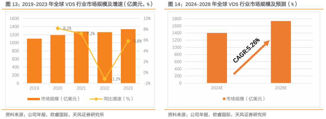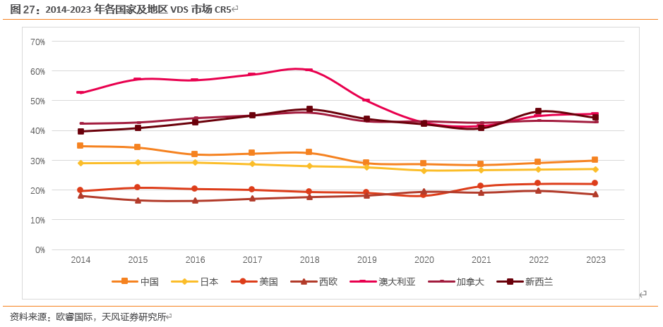 从不同国家的VDS市场市排名前五的公司占率来看,中国、日本、美国、西欧的集中度较低,且在2014-2023年间波动不大。美国、西欧CR5保持在20%左右,日本保持在30%左右,中国CR5整体呈轻微下降趋势,2023年为30.0%,较2014年下降4.8pct。澳大利亚、加拿大、新西兰市场集中度较高,且波动比低集中度市场更大。集中度最高的澳大利亚市场2023年的CR5为45.6%。