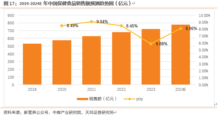 就保健食品来看,中商产业研究院发布的《2024—2029年中国保健食品行业调查及发展前景分析报告》显示,2022年中国保健食品销售额达680亿元,同比增长8.45%,2023年中国保健食品销售额约为720亿元,预计2024年中国保健食品销售额将达778亿元。