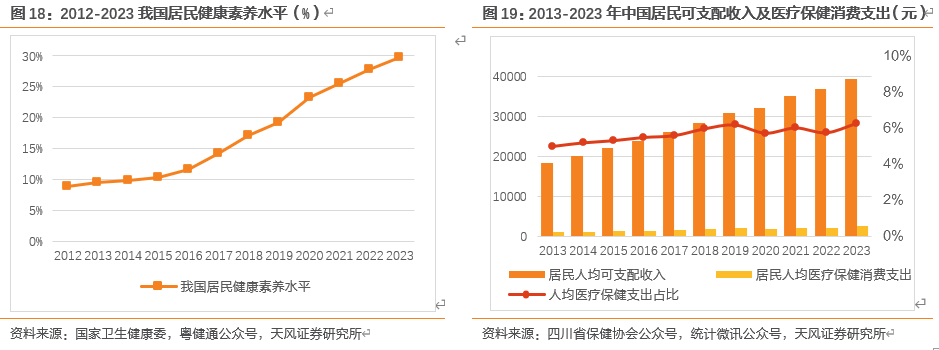 2013-2023年间,居民人均可支配收入由18311元上升至39218元,GAGR为7.91%;人均医疗保健支出由912元上升至2460元,GAGR为10.43%,增速高于人均可支配收入。医疗保健支出在人均消费支出中的占比由2013年的4.98%逐步提升至2023年的6.27%。可见随着收入水平的提升和生活水平的改善,人们的健康意识逐步提高。我们认为,随着居民可支配收入的增加及健康素养水平的显著提升,其对健康产品和服务的需求日趋旺盛,这将为健康消费市场带来持续的增长动力,医疗保健消费支出在总支出中的占比有望继续提升。