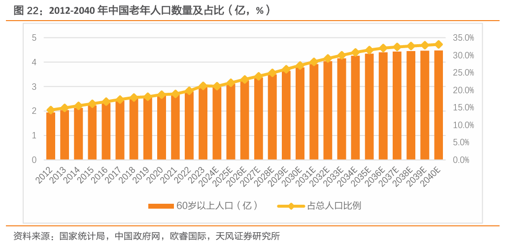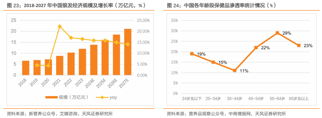 人口老龄化程度加深,“银发经济”拉动VDS增长。从人口结构看,我国老龄化人口规模庞大,人口老龄化程度的不断加深为保健食品行业带来较大的市场空间。2012至2023年间,我国60岁以上老年人口从1.94亿上升至2.97亿,占总人口比例由14.3%上升至21.21%。根据国家卫生健康委员会发布,“十四五”期间,即到2025年,中国预计进入中度老龄化阶段,老年人口突破3亿,占比超20%;2035年左右进入重度老龄化,老年人口超4亿,占比超30%。