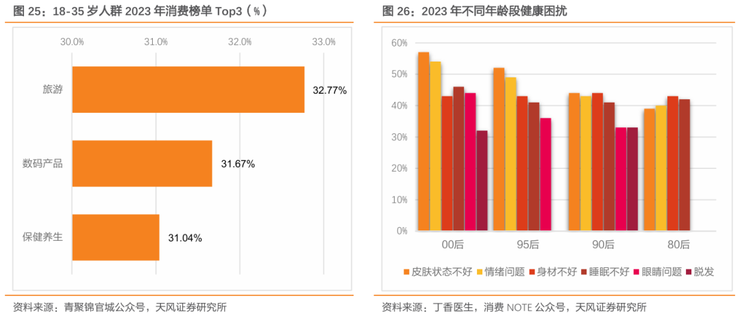 年轻群体开始养生,成为保健食品市场上的一股新力量。《中国营养健康食品行业蓝皮书》指出,营养健康食品消费最新趋势之一是人群年轻化,年轻人群维持高增速,并逐渐成为营养健康食品消费的中坚力量。《健康管理蓝皮书:中国健康管理与健康产业发展报告No.6(2023—2024)》显示,我国大多数城市常住居民用于健康养生的年均花费超过1000元,18—35岁的年轻消费人群占比高达83.7%。2023年发布的《中国美好生活大调查》显示,在18岁-35岁年轻人消费榜单排名中,保健养生位列第三。根据《2023中国新消费趋势白皮书》,超过四成00后选择为健康花钱,购买过功能性保健食品或保健仪器。我们认为,年轻群体对健康管理诉求的不断提升,带来营养健康食品的需求日益增长,助力行业加速渗透。