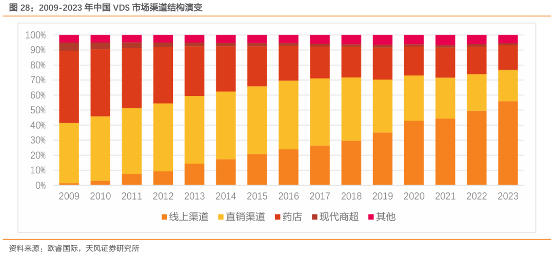 线上渠道份额逐步攀升,销售份额占比已超过50%。2009-2023年间,VDS市场各销售渠道占比变化明显。2009年,线下直销和药店销售占比达到88%,线上销售仅占比1.4%。2011年,直销渠道超过药店,位列第一。2020年,在疫情影响下,线上渠道占比不断增大,达到42.9%,超过直销渠道位列第一。2023年,线上销售份额占比已超过一半,达到56%。