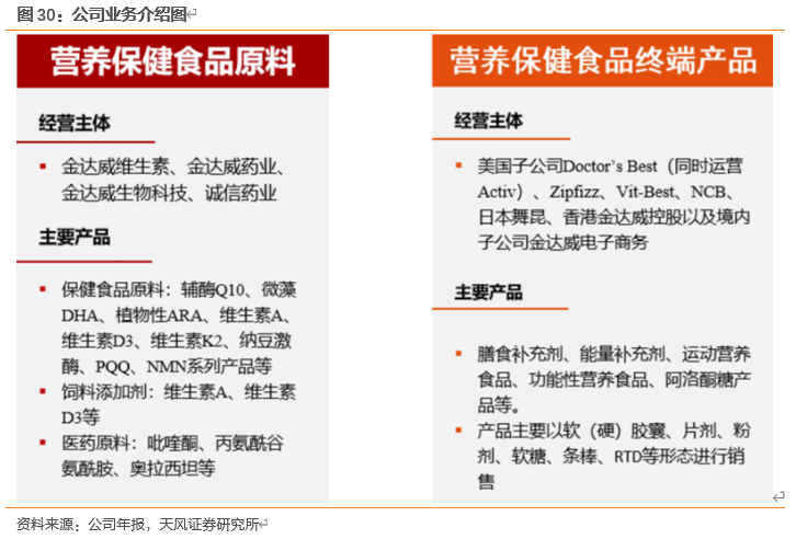 在保健食品终端领域,公司主要拥有Doctor's Best多特倍斯、Zipfizz、Viactiv、RxSugar等美国品牌及中国品牌金乐心。美国子公司VitaBest工厂已有硬胶囊(实际产能50亿粒)、片剂(实际产能40亿粒)的生产加工服务,粉剂等生产线有望后续完工投产。公司已覆盖保健食品上游原料供应、中游制剂生产、下游品牌运营及渠道布局等各个环节,是保健食品全产业链公司。