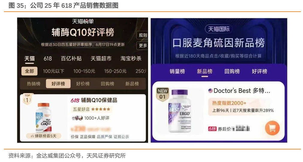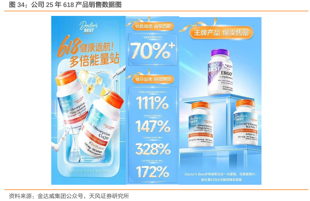 2)收购系列国际品牌,并实现跨境高增长:旗下品牌表现强劲,2025年618期间,Doctor's Best(DRB)全渠道销售额增长70%,辅酶Q10登顶天猫全周期TOP1,麦角硫因新品售罄;Zipfizz为美国Costco热销品牌,品牌销量位列美国Costco药品类目前五。此外,公司还通过并购、设立合资公司,揽获Viactiv、RxSugar品牌。