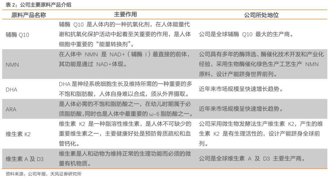 公司以合成生物学为底层技术,将其运用在多数原料产品的规模化生产中,同时积极利用合成生物技术布局新产品。公司原料产品包括辅酶Q10、DHA、ARA、维生素A、维生素D3、维生素K2、纳豆激酶、PQQ、NMN、虾青素、肌醇系列产品等;公司生产的饲料添加剂包括维生素A、维生素D3等。此外,公司亦生产吡喹酮、丙氨酰谷氨酰胺、奥拉西坦等医药原料,可用于血吸虫病、囊虫病等的治疗和预防、肠外营养、脑损伤及引起的神经功能缺失、记忆与智能障碍的治疗。