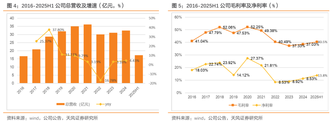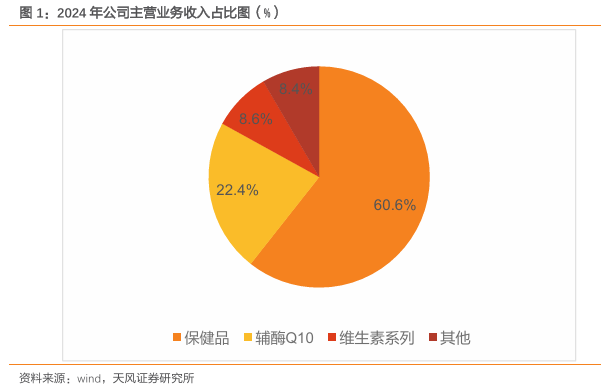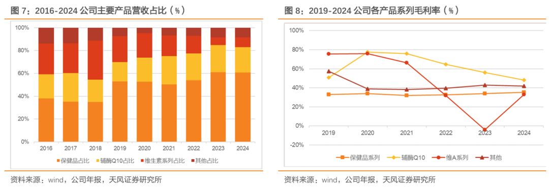 2024年公司实现营业收入32.40亿元,同比 4.4%;归母净利润3.42亿元,同比增长23.6%;毛利率为38.5%,同比 1.2pct;净利率为11.3%,同比 2.4pct。公司整体毛利率稳定处于较高水平,2016-2025Q1均维持在37%以上。辅酶Q10、保健食品贡献主要毛利。