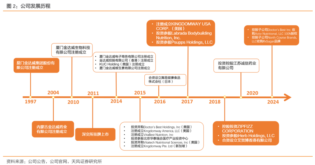不断完善自身产业布局,拓展业务范围。公司自2015年开始,先后收购、投资10余家海外企业,逐步形成了上游原料生产贸易、中游生产研发、下游品牌营销和渠道布局的全产业链布局。公司于2024年收购美国知名钙咀嚼片品牌Activ和代糖品牌RxSugar,有望进一步提升其在美国保健市场的份额和盈利能力。