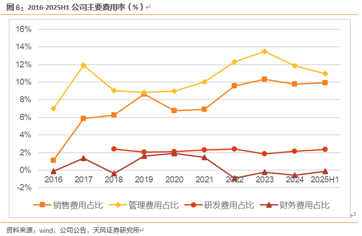 2025H1公司营业收入17.28亿元,同比 13.5%;归母净利润2.47亿元,同比大增90.1%,毛利率为40.5%,同比 3 pct;净利率为13.8%,同比 5.2 pct。费用方面,公司销售/管理/研发费用率分别同比-0.3/-2.2/ 0.2pct。