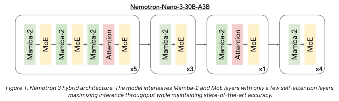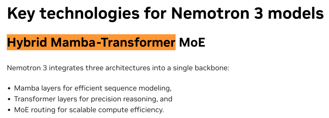 Nemotron 3采用了Hybrid Mamba-Transformer(混合Mamba-Transformer)架构。