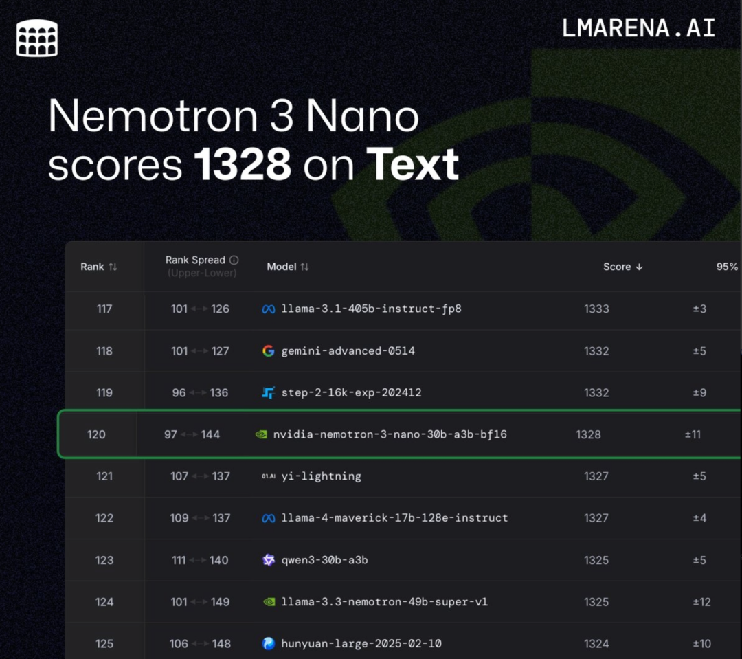 Nemotron 3 Nano(30B-A3B)目前在文本排行榜上排名第120位,得分为1328分,在开源模型中排名第47位。
