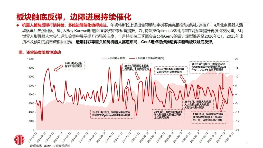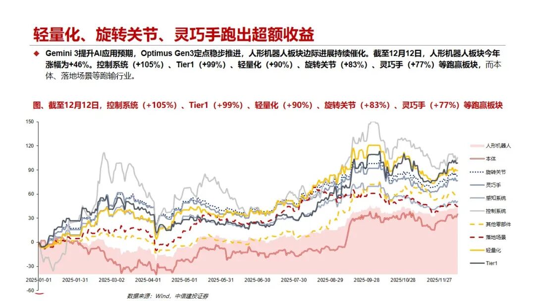 行情复盘:本周板块调整震荡,谷歌加码机器人布局、特斯拉Gen3定点推进、国内龙头订单交付等带来边际催化。以人形机器人产业链标的高比例配置的永赢先进制造智选A基金为例,最新净值2.21,本周-1.26%,近一月 4.13%,近三个月-3.88%;12.8-12.12单日涨跌幅分别约 1.27%、-0.95%、 1.07%、-1.94%、-0.67%。周涨幅居前个股包括:华培动力 17.56%、速腾聚创 11.93%、领益智造 6.01%、东睦股份 5.60%、华工科技 4.41%。机器人板块行情在经历明显回调后,在边际催化下迎来触底反弹,谷歌等巨头纷纷布局,首批科创创业机器人ETF集体上报,后续Gen3定点、审厂结果与产业链认证进展等事件催化值得重点关注,底部建议聚焦优质环节,把握确定性和灵巧手等核心变化。