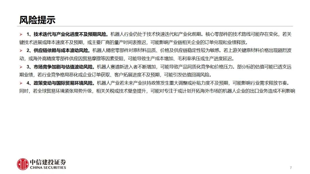 1、技术迭代与产业化进度不及预期风险。机器人行业仍处于技术快速迭代和产业化前期。核心零部件的技术路线可能存在变化,若关键技术进展或降本速度不及预期,或主要厂商的量产时间表推迟,可能影响产业链相关企业的订单兑现和业绩释放。