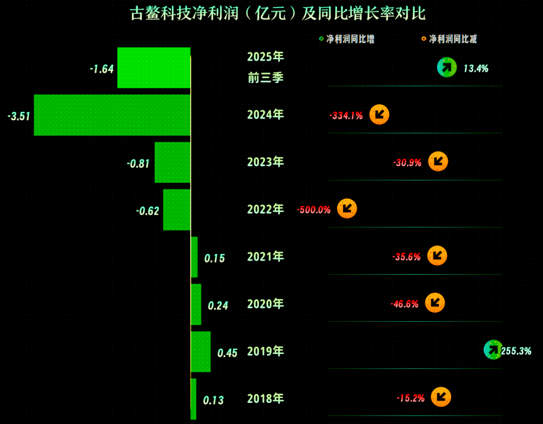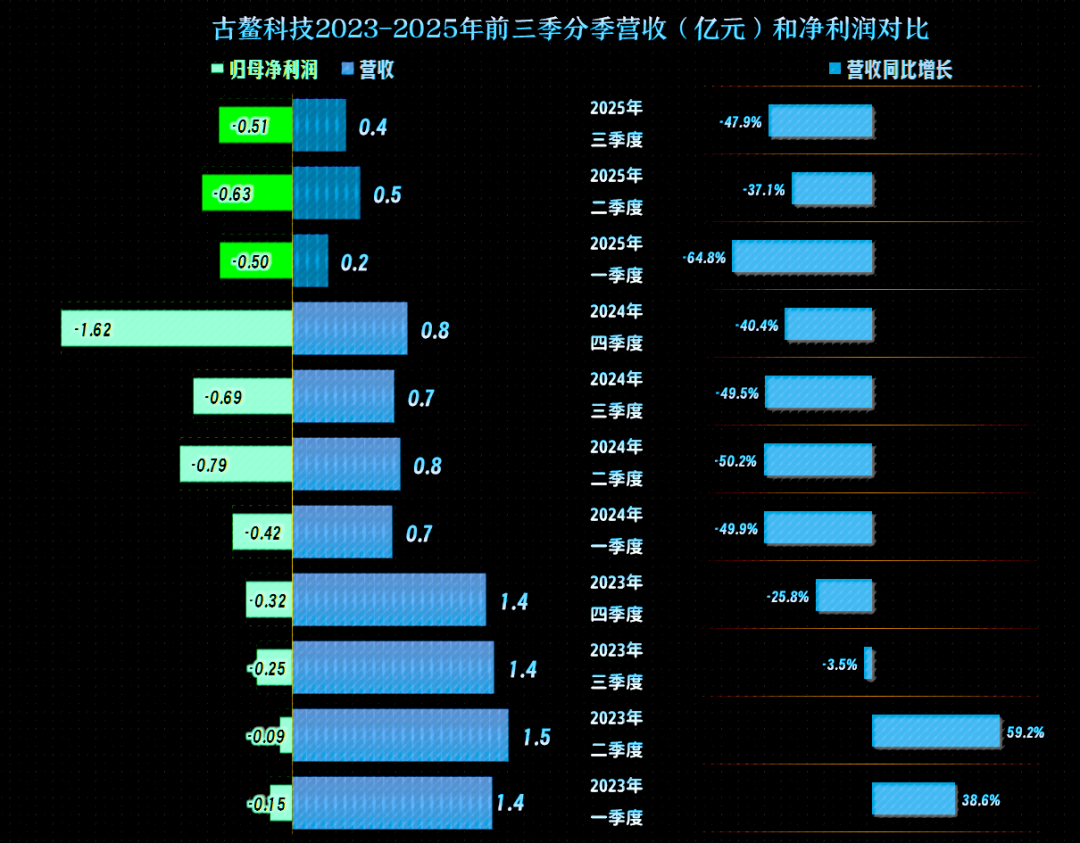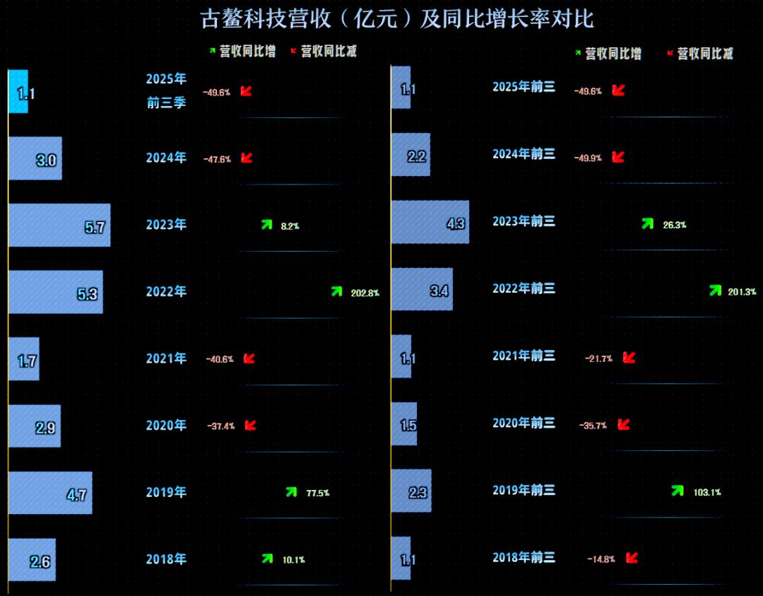 2025年前三季度,古鳌科技的营收同比接近“腰斩”,这是在上年同期腰斩基础上的再腰斩;和两年前相比,这就是“膝盖斩”了。2022年和2023年的增长,让投资者们似乎又升起了一丝希望,但2024年以来的营收表现,确实让大家坐了一盘过山车。