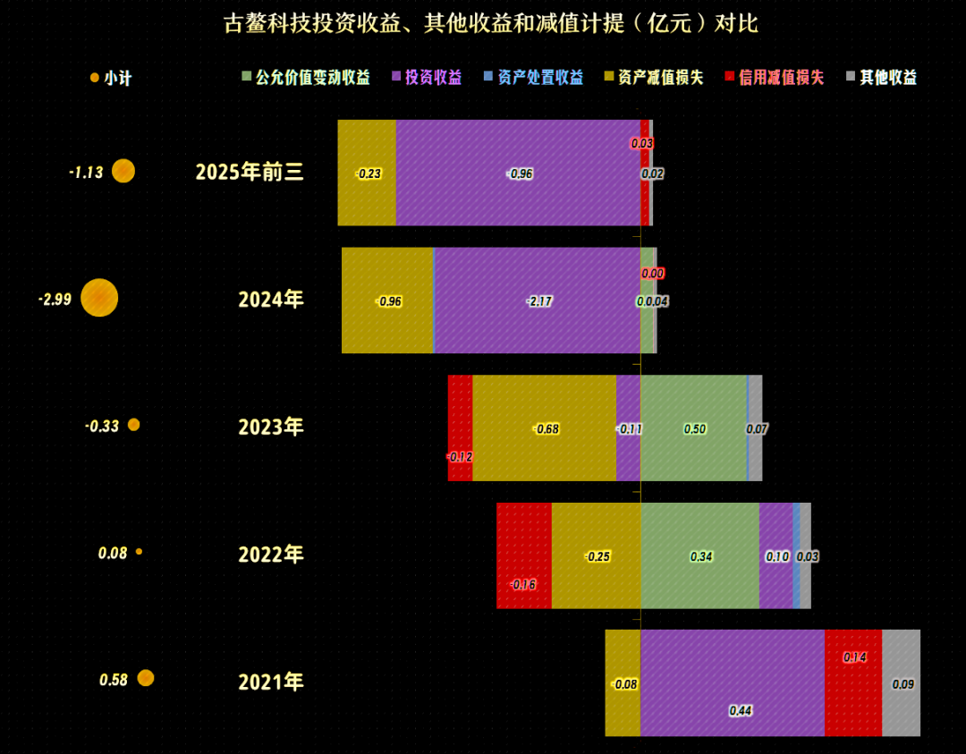 2021年主要是靠其他收益实现盈利的,2022年这方面的收益下降,2023年以来,也变成了净损失状态。特别是2024年的损失惨重。除了常见的“资产减值损失”和“信用减值损失”的影响之外,对古鳌科技更重大的影响是“投资收益”和“公允价值变动收益”。