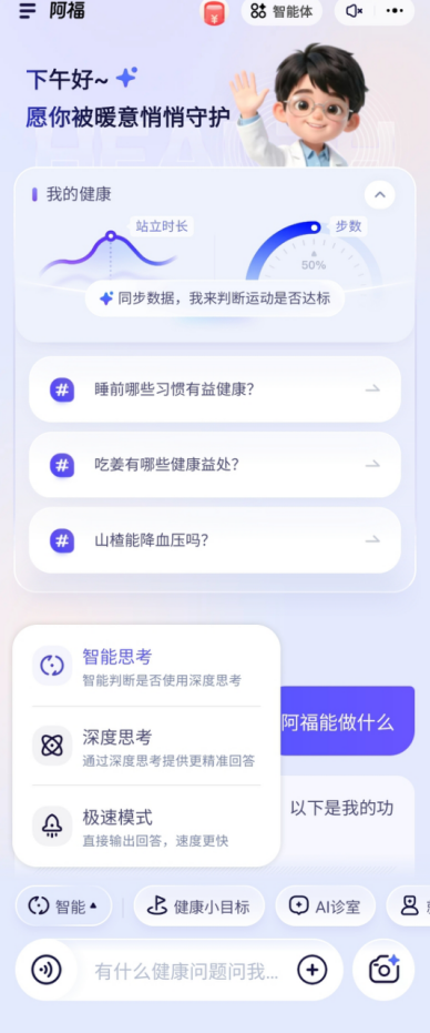 不同于同类产品单一的交互模式,蚂蚁阿福首创“深度思考 极速模式”双选项,系统智能判断,精准匹配不同用户的需求场景: