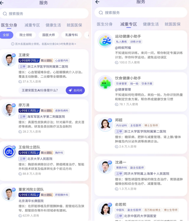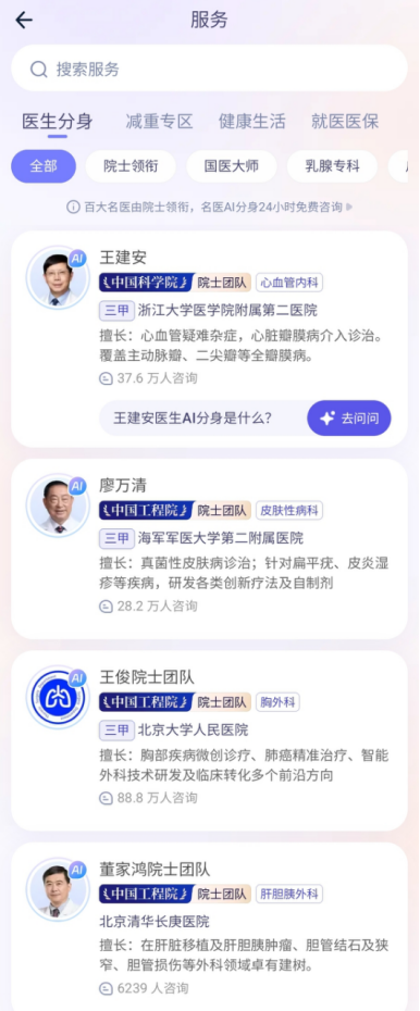 专科医生资源:汇聚三甲医院AI医生分身,如浙江大学医学院附属第二医院王建安院士团队(心血管内科,37.6万人咨询)、海军军医大学第二附属医院廖万清院士团队(皮肤性病科,28.2万人咨询),让用户足不出户即可获取权威专科建议。