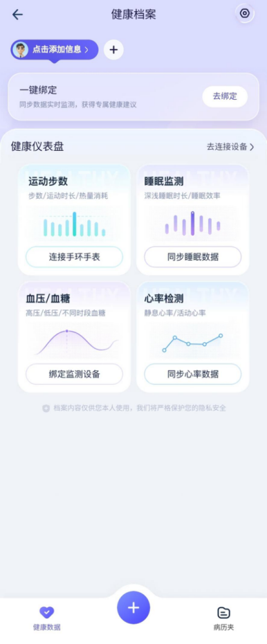 操作便捷性:支持一键绑定监测设备、同步健康数据,拍药盒、拍报告功能简化信息录入流程,即使是老年用户也能轻松操作;