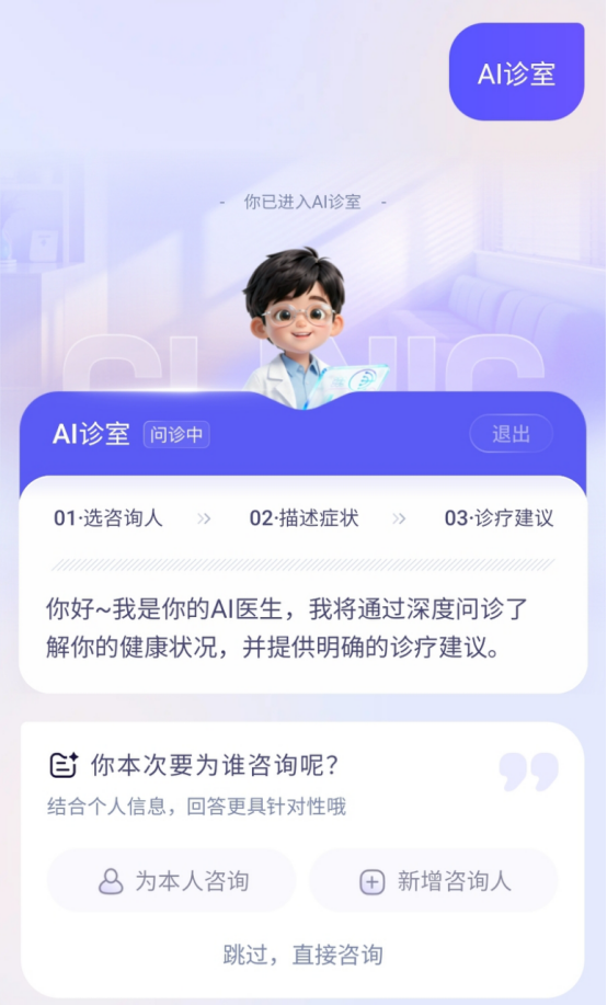 即时咨询需求:AI诊室提供“选咨询人-描述症状-获取诊疗建议”的标准化问诊流程,支持本人咨询、新增家人咨询人,适配家庭健康管理场景;