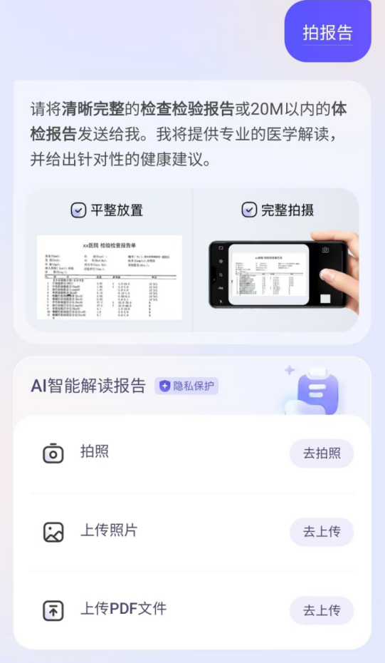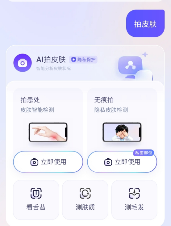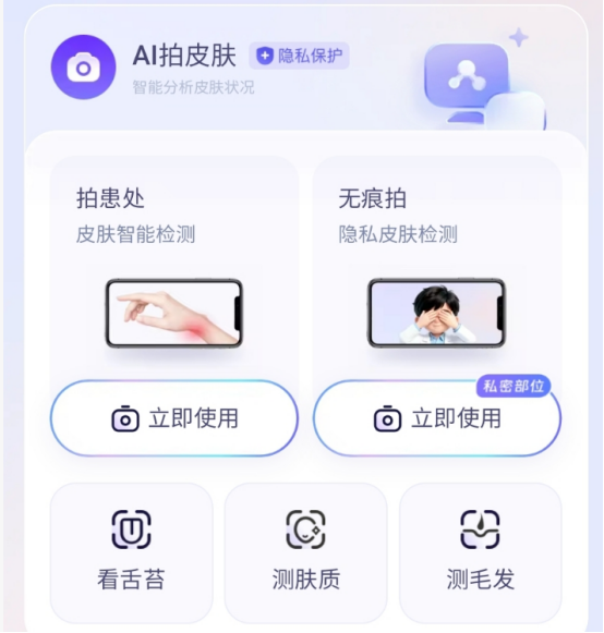 专项检测工具:AI拍皮肤功能支持无痕拍摄检测、毛发/舌苔/肤质分析,兼顾隐私保护与精准检测,解决用户“轻医美咨询”“皮肤问题初步判断”的刚需;