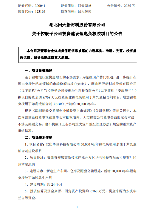 基于锂电池行业快速增长的市场需求,为紧抓国产替代机遇,进一步提升在锂电负极胶粘剂领域的市场份额与核心竞争力,湖北回天新材料股份有限公司(简称“公司”)控股子公司安庆华兰科技有限公司(简称“安庆华兰”)拟以自筹资金约9,768万元投资新建锂电负极用丁苯乳液粘合剂项目,增加锂电负极用丁苯乳液粘合剂(SBR)产能约50,000吨/年。