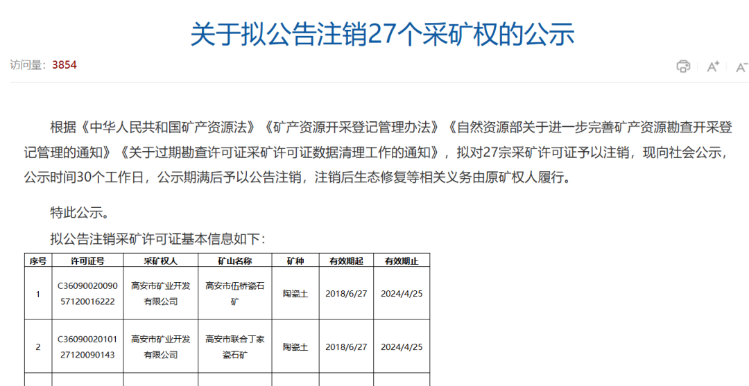 这波采矿权注销引发市场震动,但并非监管层临时加码,而是长期合规清理的正常落地。宜春市自然资源局近日挂出《关于拟公告注销27个采矿权的公示》,明确依据《矿产资源法》等法规,计划注销27宗采矿许可证。公示期从2025年12月12日到2026年1月22日,共30个工作日,公示结束后就会正式注销,后续的生态修复责任也由原矿权人承担。