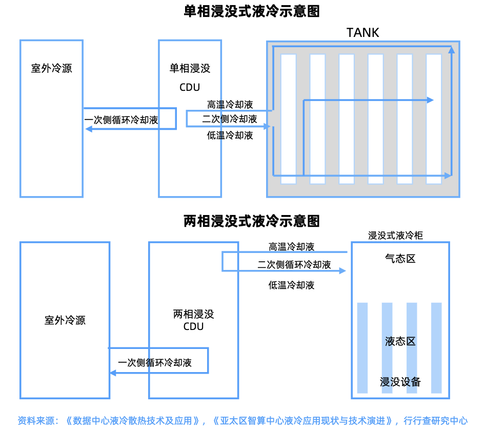 根据冷却液在循环过程中是否发生相变,分为单相浸没式液冷和两相浸没式液冷。两种液冷方式均依赖于室外冷源和CDU(冷却分配单元)来实现散热效果,但是在设备要求上存在显著差异。