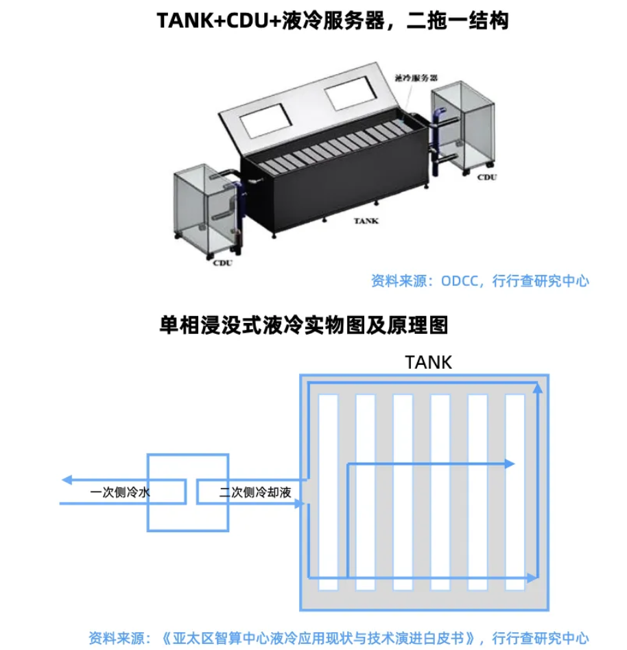 浸没式冷却系统的通用架构与冷板式一致,二次侧由冷却池(Tank)、冷却液、热交换器(CDU)和循环泵组成。