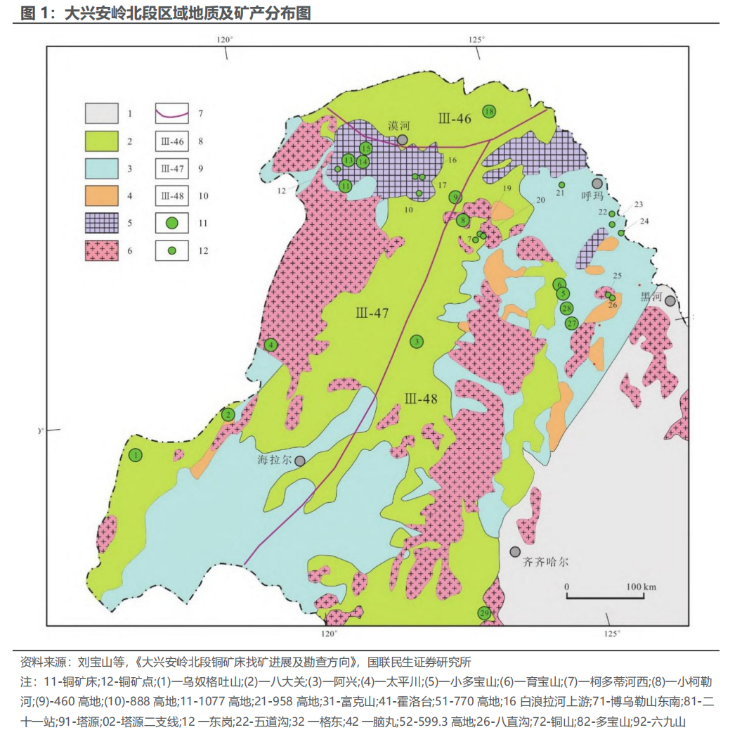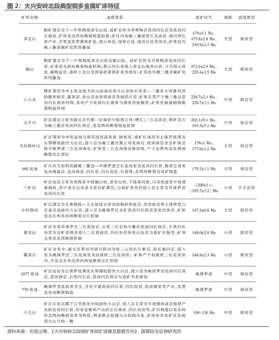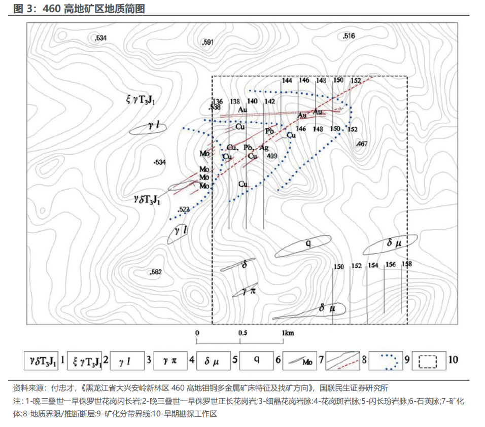 背景方面。460 高地铜钼矿早于 2019 年由黑龙江省第九地质勘查院发现, 属大兴安岭北段地区。大兴安岭北段在大地构造位置上属于兴蒙造山带东段,成矿作用复杂而强烈,形成多处大、中、小型铜矿床。参考中国地质调查局沈阳地质调查中心及黑龙江省自然资源调查院资料,截至 2024 年大兴安岭北段已发现铜矿床及矿点数十处,目前达到大型规模的有多宝山、铜山、乌奴格吐山、小柯勒 河、460 高地铜矿床等 5 处。