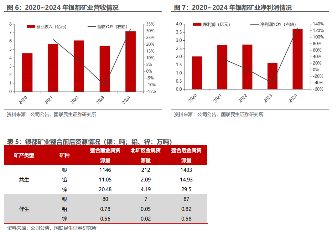 北矿区完成整合,资源可持续性增强。受银价大幅上涨影响,2024 年银都矿业实现营收/净利7.15/3.70亿元,同比增加31.43%/120.95%,降本增效成果显著,为公司提供良好基本盘。2024 年 2 月,银都矿业 1.43 平方公里北矿区通过评审备案并于同年 8 月完成矿业权整合,整合完毕后共生矿产保有银金属资源量1433 吨,同比增长 17.4%,平均品位 222 克/吨;铅金属量 14.9 万吨,同比增长 16.3%;平均品位 2.46%;锌金属量 29.5 万吨,同比增长 16.5%,平均品位 4.10%; 伴生矿产保有银金属资源量 87 吨,同比增长 8.8%,铅金属量 8212 吨,同比增长 5.8%,锌金属量 5842 吨,同比增长 3.9%,资源可持续性进一步增强。