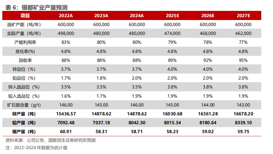 考虑银都矿业整合后资源可持续性增强,我们预计2025-2027年银都矿业将实现锌产量为1.60/1.64/1.67万吨,铅产量为8015/8180/8339 吨,银产量为 58/59/60 吨。