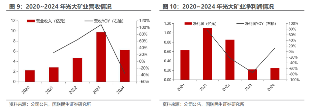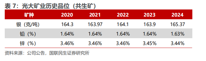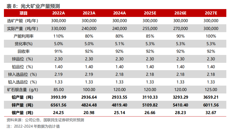 早期业绩兑现能力强,近年受品位影响产量下滑。大地矿山采用平硐加竖井联合开拓,采矿方法为浅孔留矿法;选矿采用“优先选铅(含银)再选锌”的浮选工 艺流程,年采选规模为 30 万吨。早期矿山收购时根据《业绩承诺补偿协议》, 2017-2019 年矿山承诺累计净利 1.72 亿元,2019 年矿山实现累计净利1.97亿元,业绩承诺完成率 106.18%。2021 年,光大实现净利1.1亿元,创历史新高, 2022 年实现净利 0.86亿。2023 年由于开采矿段白银品位下滑致产量下降,全年实现净利润仅有 0.22 亿元,同比下滑 74%。2024 年实现净利润 0.25 亿元,盈利同比由负转正。
