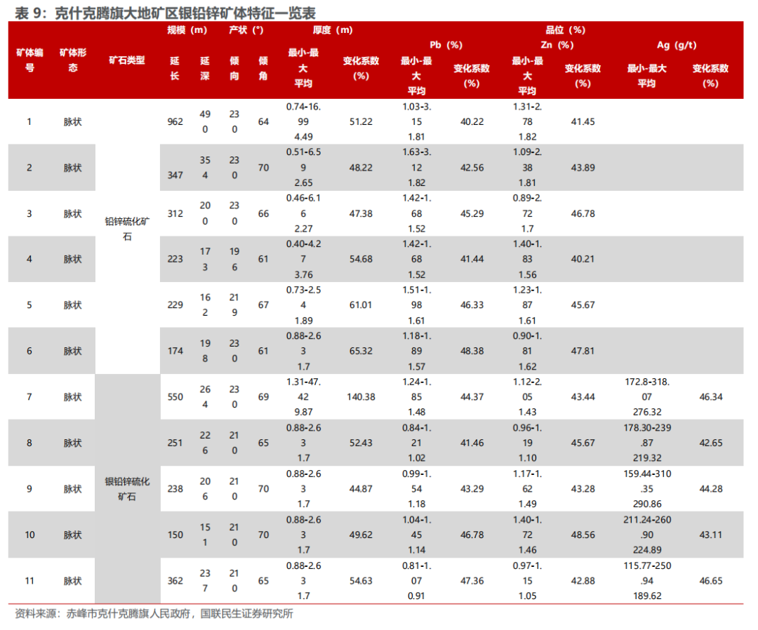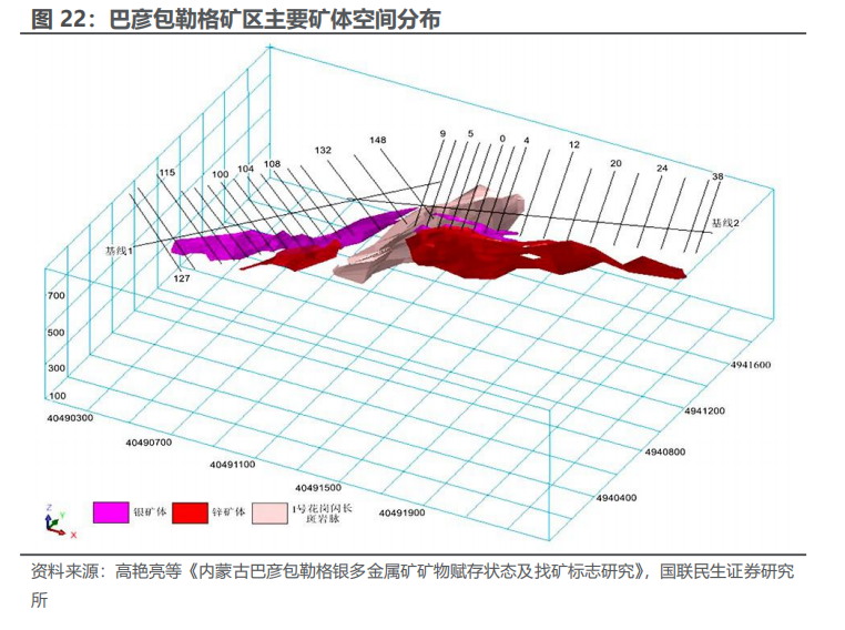 矿产资源丰富,产量潜力大。巴彦包勒格矿区资源储量(探明 控制 推断) 矿石量 1811 万吨,银金属量 612 吨,平均品位 140.45 克/吨;铅金属量 16620 吨, 平均品位 1.58%;锌金属量 361160 吨,平均品位 2.60%。矿区共圈定矿体 12 条,矿体成矿元素分布具有较为明显的垂直分带性,浅部以银矿化为主,深部以铅锌矿化为主,矿床内无氧化矿带,仅存在混合矿带及原生矿带。矿石矿物主要为为自然银、辉银矿、辉锑银矿、方铅矿、闪锌矿。根据采矿许可证,矿山生产 规模为 90 万吨/年,按照 140 克/吨品位以及 92%回收率假设,预计满产后实现白银年产量约 109 吨。