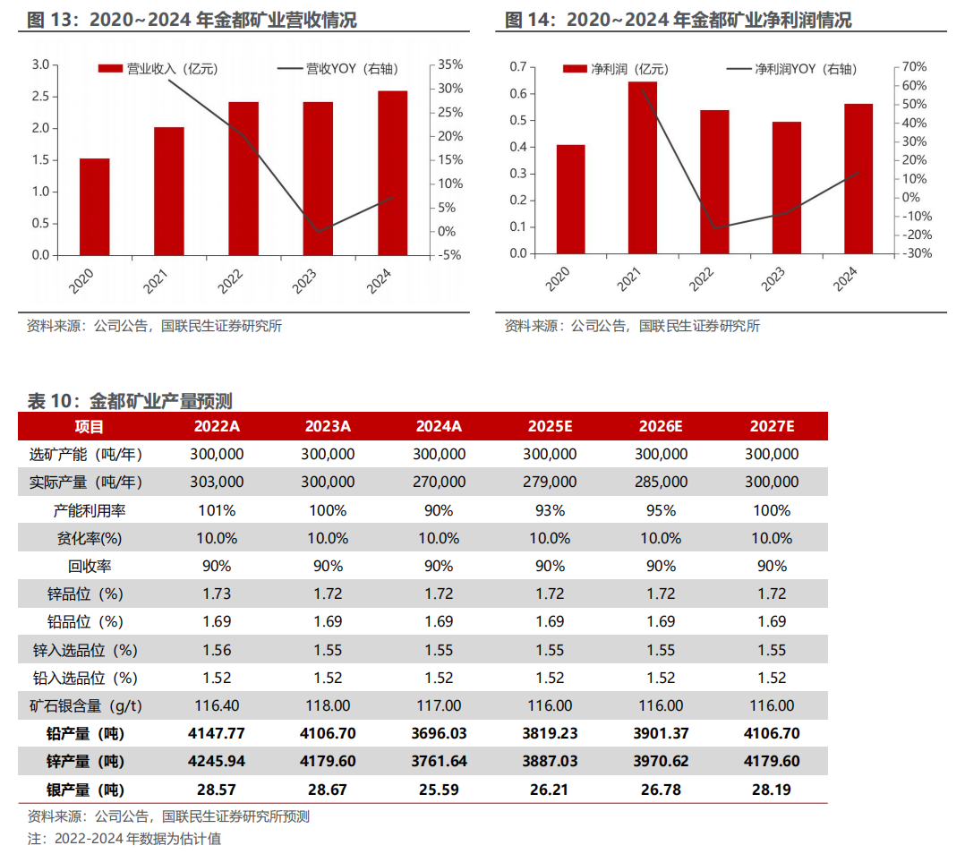 矿山近年经营情况良好,业绩稳健。金都自 2020 年以来盈利能力稳定,生产经营无重大事件影响。2024 年金都实现营收 2.59 亿元,同比增长7.2%,实现净利润 0.56 亿元,同比增长 13.6%。我们预计 2025-2027年金都将实现银产量26/27/28吨、铅产量3819/3901/4106 吨,锌产量 3887/3970/4180 吨。