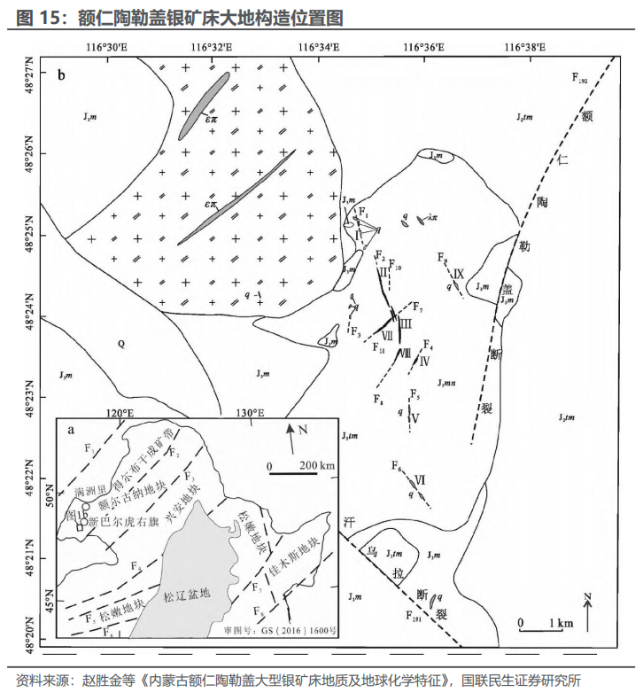 金山矿业为公司唯一一座在产金银矿山,核心资产为额仁陶勒盖矿区Ⅲ—Ⅸ 矿段银矿。内蒙古金山矿业地处呼伦贝尔草原西部,地处额尔古纳兴凯地槽褶皱带与喜桂图海西地槽褶皱带的接壤部位,区域性构造断裂较发育,构成具有独特性棋盘状构造格局,地形地貌属低山、丘陵类型,地势南高北低,地表相对平缓区域内构造以断裂构造为主,总体呈北东-南西走向,延长均在百米以上。南西部多以火山岩为主,北西-南东以断陷地为主,形成了北东向展布的满洲里—新巴尔虎右旗火山-侵入-岩浆杂岩带。矿区内共圈出具有工业利用价值的银矿体共 47 条, 其中主矿体一共有 3 条(21#、32#、75#),整体呈“入”字形分布。