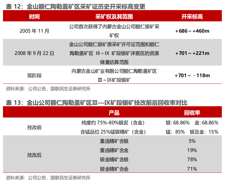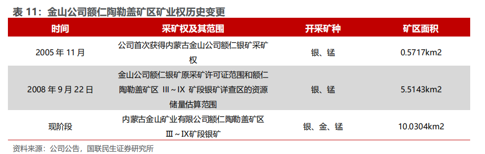 矿山采矿活动最早可追溯至 1996 年,起初名为“新巴尔虎右旗鑫洪锰银矿”。 后将采矿权于 2004 年转让给金山矿业,2005 年更名为“内蒙古金山矿业有限公司额仁银矿”。在采矿权经历多次变更延续后目前生产规模为 48 万吨/年。除采矿权外,银矿外围还有 11.04 平方公里的探矿权,具备一定增储扩产潜力。
