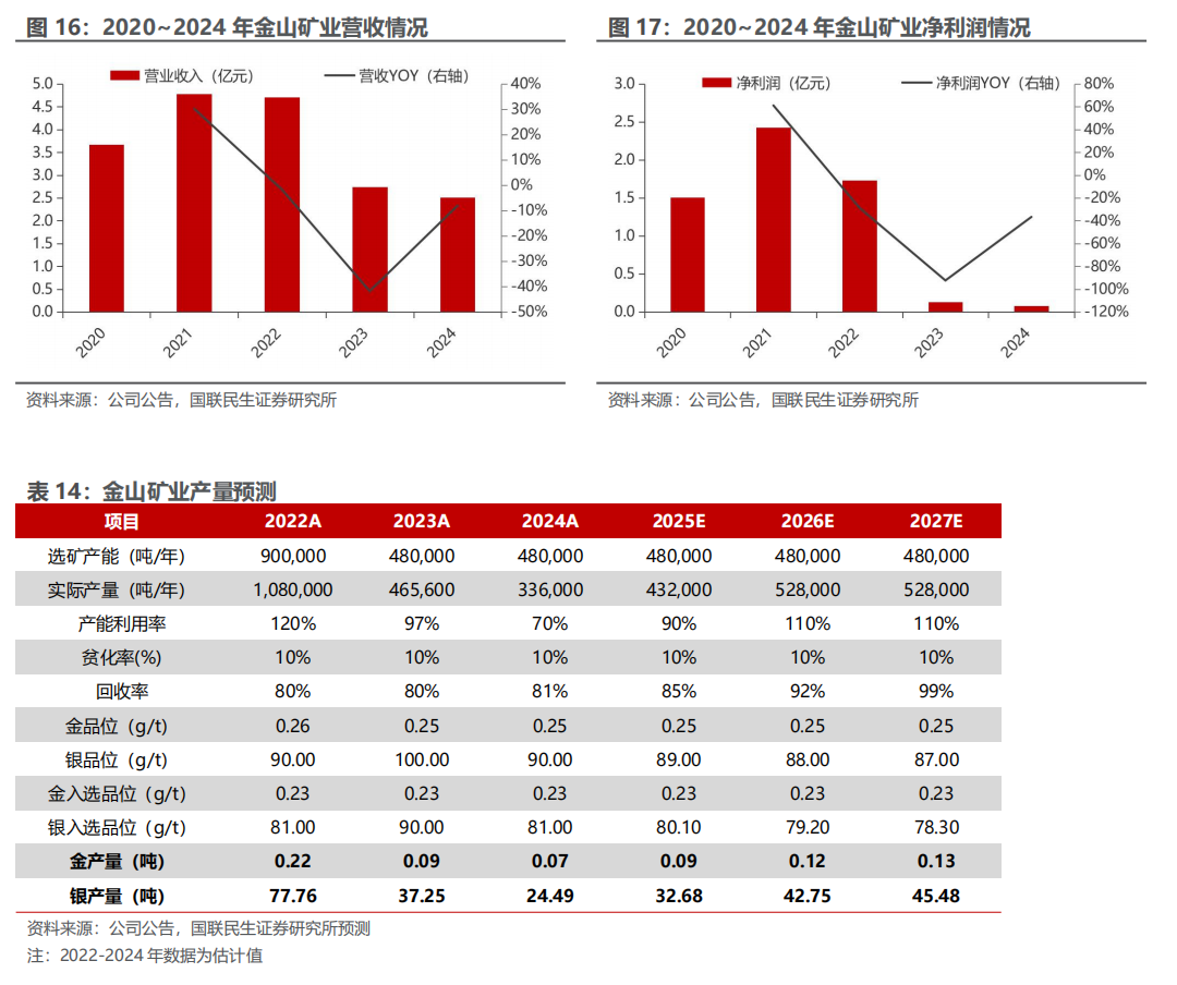 剩余股权收购落地。矿山早期由集团持股,后于 2018 年注入上市公司 67% 股权,2024 年11月12日上市公司拟收购集团所持剩余 33%股权,按照评估报 告净资产 33%权益评估价值约为 6.2 亿元,2024 年12 月已完成工商变更登记并取得新营业执照。从经营情况看,2020-2022 年矿山净利润保持在 1.5 亿元以上,2023 年由于回收率下降以及技改工作影响,矿山仅实现净利润0.13亿元,同比减少41.8%/92.4%。2024 年金山矿业技改后完成产能释放,采选规模提升至 48 万吨/年,通过将全泥氰化工艺改造成浮选工艺有效提高银、金回收率并降低生产成本。根据公告,剩余股权收购时集团承诺金山矿业 2025 年至 2027 年三年累计净利润不低于 4.7 亿元。伴随技改完成我们预计金山矿业产量将逐步回归, 2024-2026 年实现银产量 33/43/45 吨。