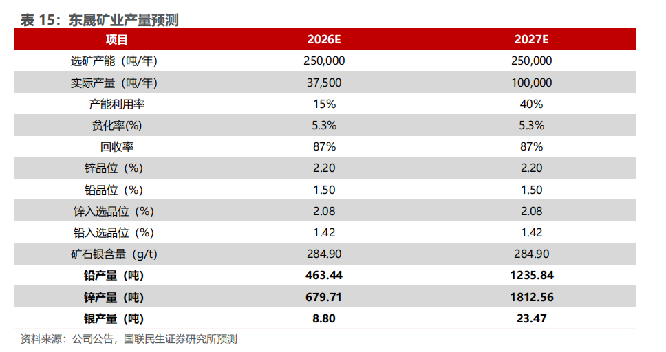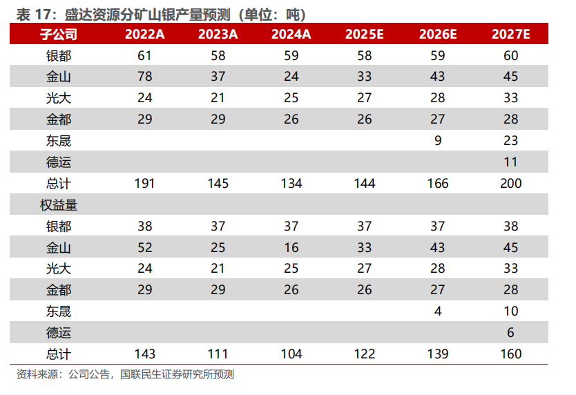 综上,结合公司公告,在银都矿业权整合完毕后选矿量及品位有所提升、金山矿业剩余股权收购及技改完成后产量如期释放、鸿林矿业试生产顺利产量如期爬坡、2026 年东晟顺利投产、2027 年德运顺利投产的假设下,预计公司 2025/2026/2027 年实现白银产量144/166/200 吨 , 权益银产量分别为 122/139/160 吨。
