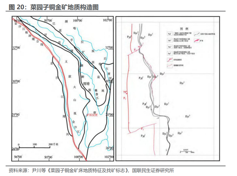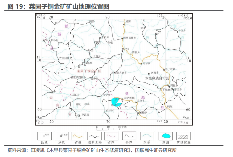 公司金矿资源除金山矿业外均来源于鸿林矿业。鸿林矿业核心资产菜园子铜金矿位于四川凉山州木里县城西北方向,直线距离约 77km 的宁朗乡境内,在宁朗乡 260°方向的菜园子沟和喇嘛厂沟附近。从地质角度看,该矿位于甘孜-理塘构造带南段,是我国重要贵金属成矿带之一。矿带区域还有四川黄金旗下的梭罗沟金矿以及耳泽金矿、阿加隆洼金矿、噶拉金矿等矿床几十处,具有良好的成矿潜力及找矿前景。