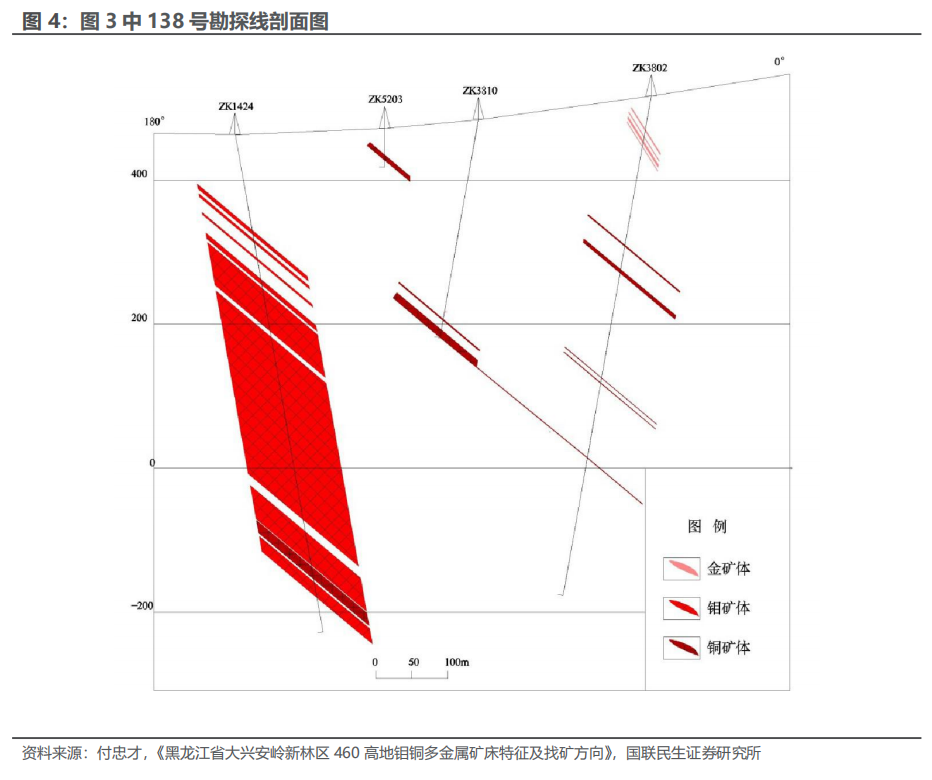 矿体分布上,早期 2020 年区内发现钼矿体 3 条,铜矿体 11 条(其中低品位矿体 7 条),金矿体 7 条及铜多金属矿化体 1 条。钼矿体控制长度 200~600m、延深 60~600m、平均厚度 3.56~54.51m,Mo 平均品位 0.073%~0.102%、 伴生 Cu 最高品位 0.18%;铜矿体控制长度 200m、延深 200~560m、厚度 1.14~7.33m,Cu 平均品位 0.23%~1.22%、伴生 Mo 最高品位 0.051%;金矿体矿体长度 80~410m、延深 47.5~225m、厚度 0.84~3.18m,最大平均品位 4.09x10-6。参考图 3 及图 4,矿体在空间上具有分带性,在地表钼矿体主要见于 136 线、铜矿体见于 136~144 线,144 线以东及铜矿体北部为金矿体出露部位; 从 138 线剖面上看,垂向上表现为:从地表到深部依次为金矿体、铜矿体、钼矿体。