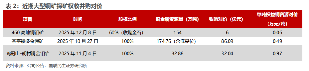 矿山对价较为优惠,实现前瞻布局。2025 年 12 月 8 日,盛达资源以 5 亿元取得金石矿业 60%股权,参考近期国内大型铜矿探矿权收并购案例,公司此次收购权益铜资源量对价仅 0.06 万元/吨,远低于茶亭铜多金属矿探矿权(约 0.49 万 元/吨)及鸡冠山-胡村铜金钼矿探矿权(约 0.97 万元/吨)。实际公司矿业团队从几年前开始接触并跟踪金石矿业 460 项目,公司秉持性价比优先、抗风险的原则筛选项目,与合作方理念契合,认同开发后合力共赢,而非初期高溢价并购,最终与交易对方达成合作。