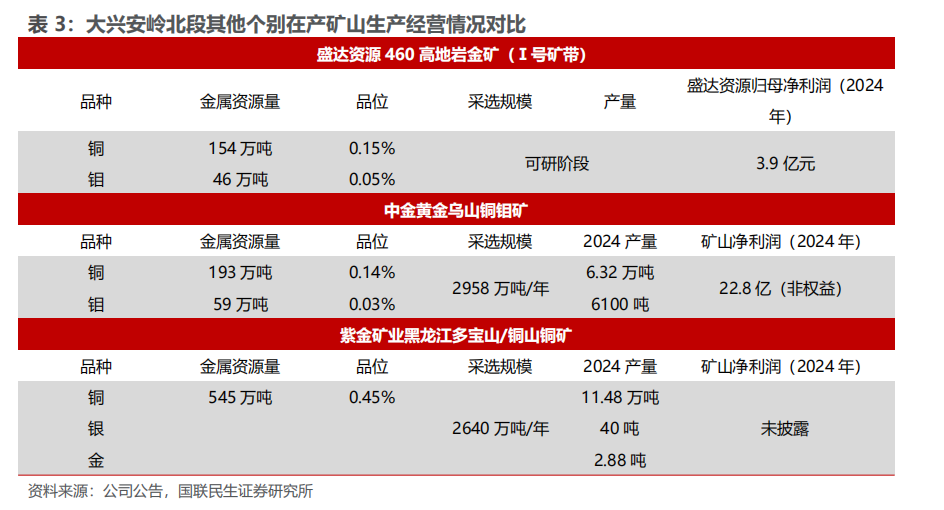 类比资源禀赋类似在产矿山,若具规模矿山有望助力业绩高增。参考大兴安岭北段其他大型规模在产矿山产量业绩情况,中金乌山铜钼矿铜钼金属资源量略多于 460 高地岩金矿,但后者三条蚀变带仅探明一条,铜钼品位二者整体相当。 2024 年乌山铜钼矿实现铜/钼产量 6.32 万吨/6100 吨,全年实现业绩约 22.8 亿 元,若未来 460 高地岩金矿能具备一定生产规模,对比盛达资源 2024 年 3.9 亿归母净利润,有望未来助力公司实现业绩高增。