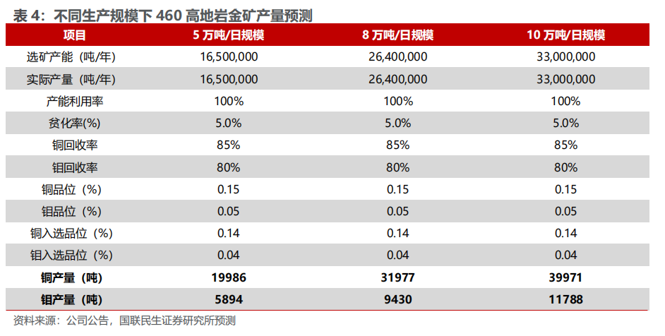 铜钼产量预测:出于保守估计,假设矿山贫化率 5%以及 85%铜回收率、80% 钼回收率,以矿山探明资源口径为品位依据,在 5/8/10 万吨采选规模以及 330 天/年的生产工期假设下,矿山对应铜金属年产量约 19986/31977/39971 吨,钼年产量约 5894/9430/11788 吨。