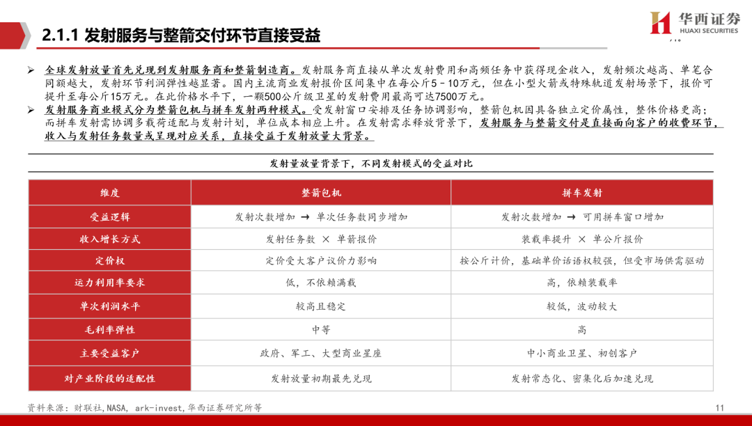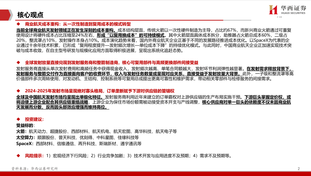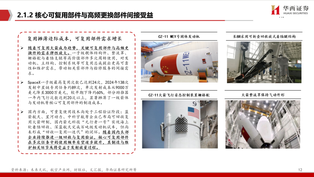 ► 全球发射放量直接兑现到发射服务商和整箭制造商,核心可复用部件与高频更换部件间接受益