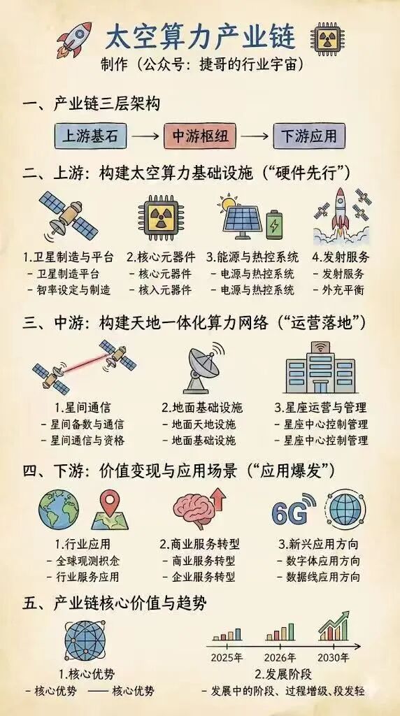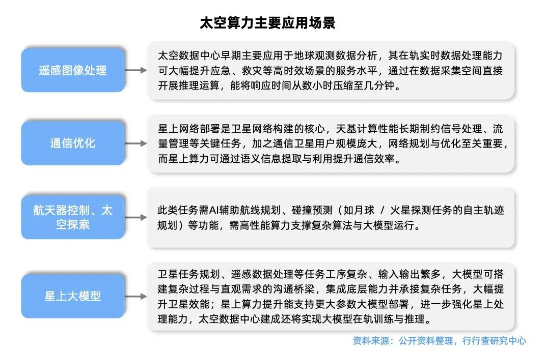 太空算力将传统遥感卫星从“数据回传”升级为“在轨智能处理”,突破地面数据中心运营的能源与散热瓶颈,使得卫星成为可实时响应的“太空智能终端”,直接驱动低轨星座建设,催生出多场景需求,开辟商业航天新增长曲线。